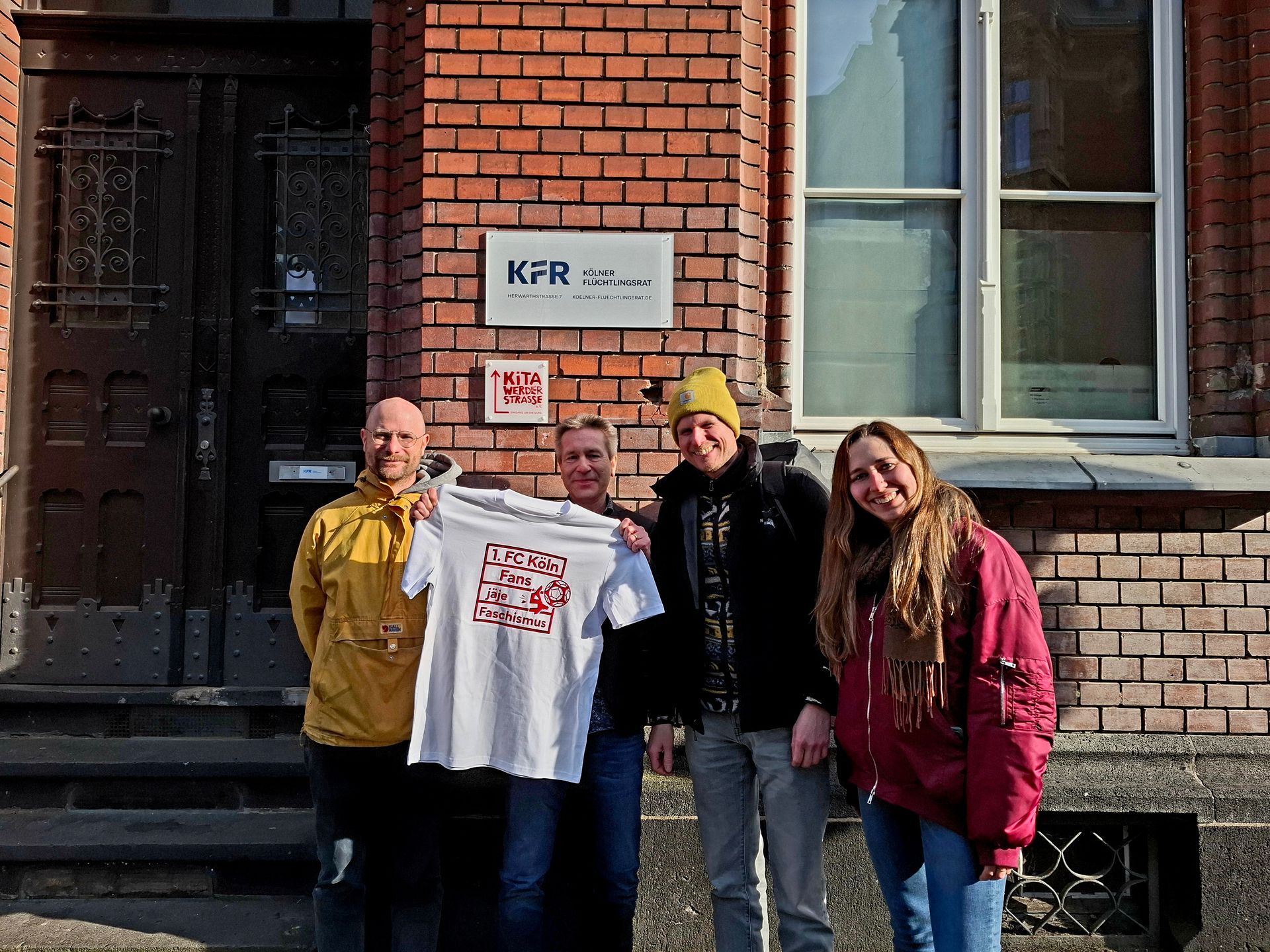 12.03.2025 - Das heutige Treffen mit Claus-Ulrich Prölß, dem Geschäftsführer des Kölner Flüchtlingsrates, stand ganz im Zeichen der Solidarität. Vertreter:innen des Kölner Fanprojekts und der Initiative Keine Jeck es illejal überreichten dem Kölner Flüchtlingsrat den Spendenbetrag von 4.000 Euro. Im Rahmen der #NieWieder-Woche und dem Erinnerungstag im deutschen Fußball, wurden am 19. Spieltag des FC, T-Shirts mit der Aufschrift "1. FC Köln Fans jäje Faschismus" gegen Spenden verteilt. Nachdem die Nachfrage so hoch war, wie Chrissy (Kölner Fanprojekt) berichtete, kam es zu einer großen Nachbestellung. Alle Spenden wurden für den Kölner Flüchtlingsrat gesammelt.